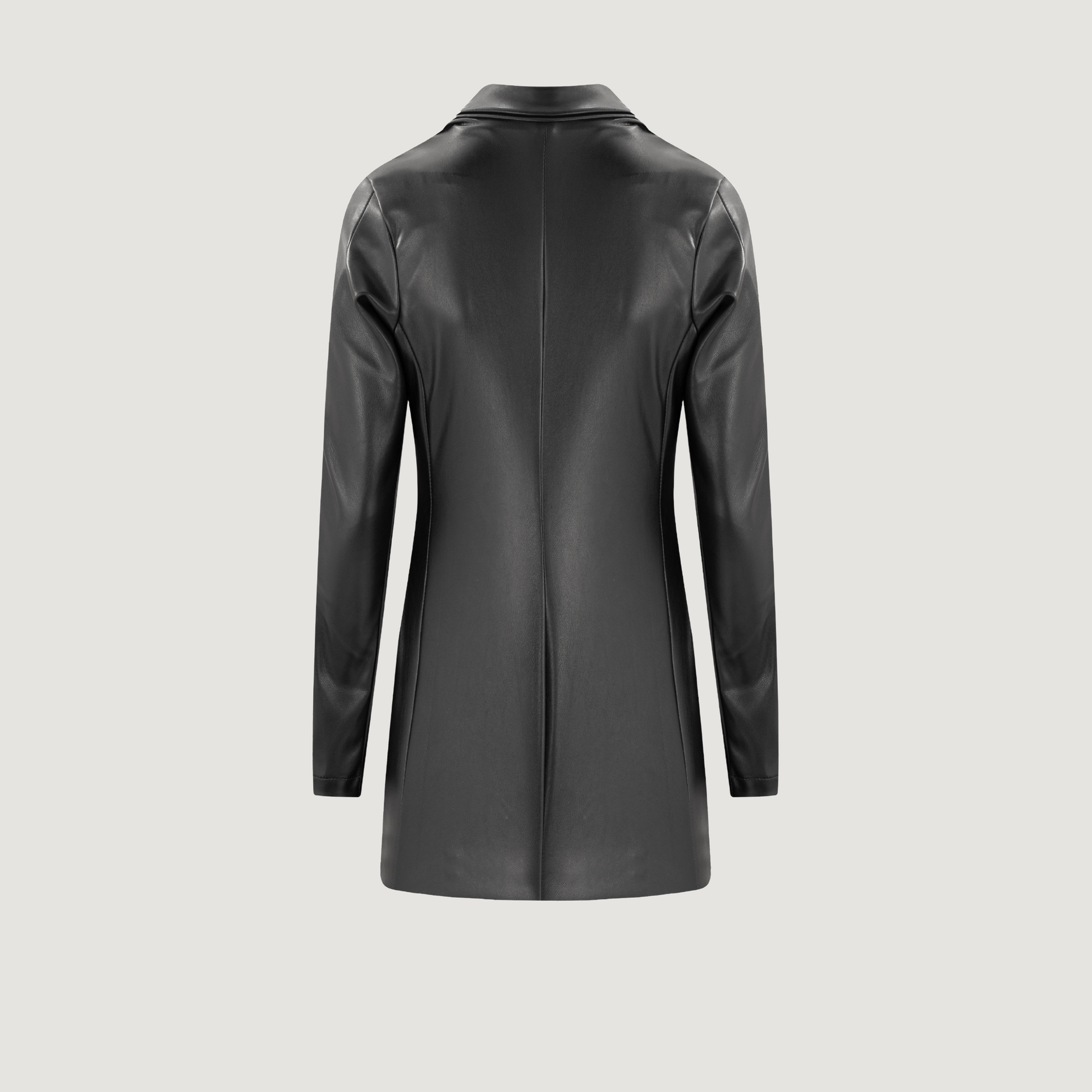 Este blazer de piel sintética aporta sofisticación y simplicidad a cualquier atuendo, perfecto para uso comercial o informal.