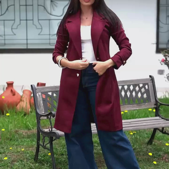 Women’s clothing made to stand out—discover this sleek Burgundy midi coat.